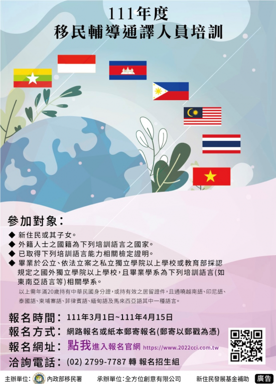 三、本案培訓課程共計2日(含測驗),報名期間自111年3月1日至111年4月15日止,採網路報名(報名官網:https://www.2022cci.com.tw)或郵寄報名(以郵戳為憑),參訓者完全免費;爰請貴校協助宣導、鼓勵年滿20歲持有中華民國身分證,或持有效之居留證件,且通曉越南語、印尼語、泰國語、柬埔寨語、菲律賓語、緬甸語及馬來西亞語等其中一種語言之新住民或其子女,或其他符合本案培訓對象資格者,踴躍報名參訓。