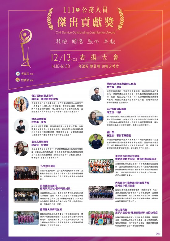 二、本(111)年公務人員傑出貢獻獎業經考試院組成評審委員會評選出6名得獎人及6組得獎團體。為表揚得獎者傑出事蹟,考試院訂於本年12月13日(星期二)下午2時10分於該院傳賢樓10樓大禮堂舉行表揚大會,並同步辦理Facebook網路線上直播,檢附旨揭表揚大會電子海報及得獎者具體事蹟簡介各1份,請惠予公告周知。又電子海報及得獎者具體事蹟簡介之檔案業置於銓敘部全球資訊網首頁(http://www.mocs.gov.tw/)「傑出貢獻獎」之「最新消息」項下,請自行下載運用,廣為宣傳(電子海報部分之列印以A3以上尺寸為佳)。