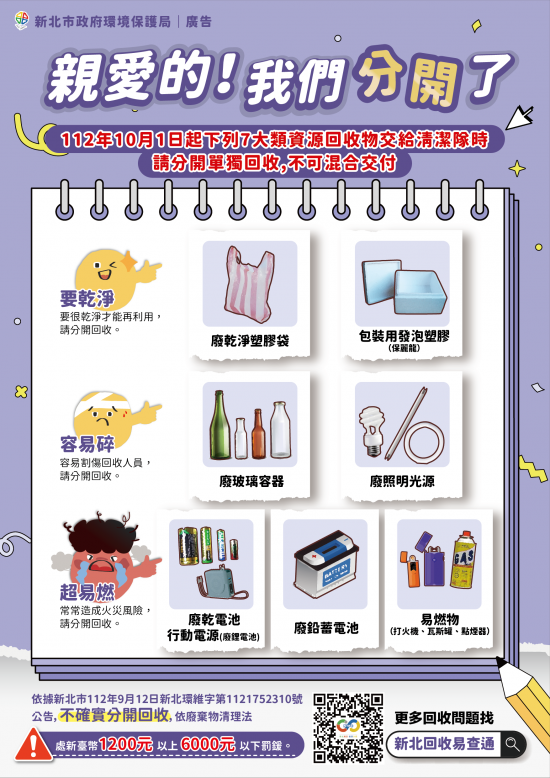 二、旨揭公告自112年10月1日起生效,公告內容涉及家戶產生之一般廢棄物應回收項目其分類及排出方式,新增公告排出之廢乾淨塑膠袋、廢玻璃容器、包裝用發泡塑膠(保麗龍)、廢照明光源、廢乾電池與廢鉛蓄電池、易燃物(卡式瓦斯罐、打火機、點煙器等)應分開單獨交付回收,且盛裝資源回收物之袋子或箱子,應使用可由外觀辨明內容物之透明或半透明材質,始能交付回收。