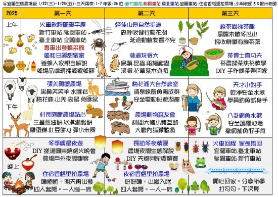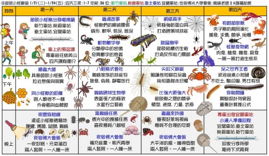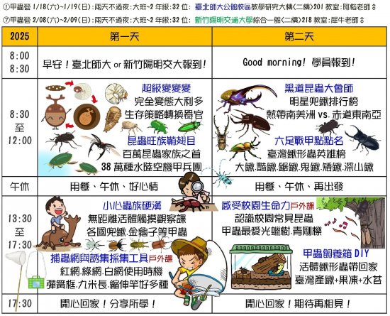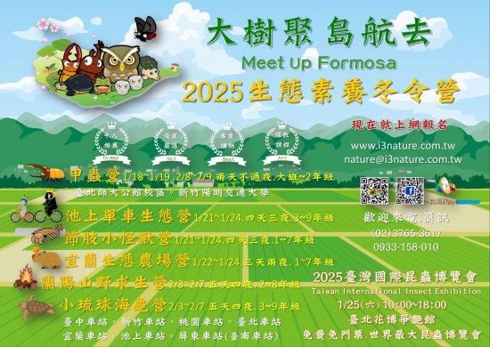 說明:愛上大自然文教將於114年寒假辦理【大樹聚島航去】 2025生態素養冬令營共七個梯次,暨參展2025第六屆臺灣國際昆蟲博覽會活動。