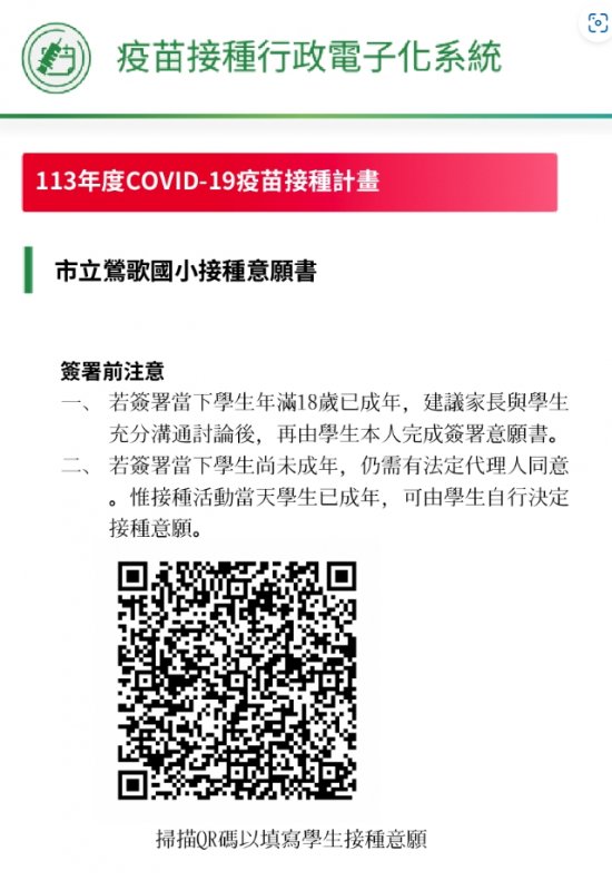 covid-19疫苗接種意願書線上簽署連結https://consensus.cdc.gov.tw/parent/ag ... ZE&vg=COVID&y=113