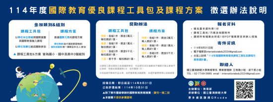 • 教育部將於114年10月31日(星期五)公布得獎名單於教育部中小學國際教育全球資訊網(網址:https://www.ietw2.edu.tw/