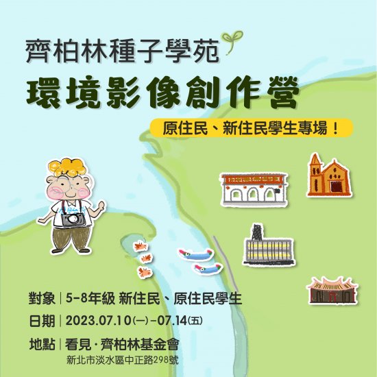 該基金會是於齊柏林導演辭世後成立,其宗旨係將齊導演遺留下海量的影像典藏保存,並將其守護台灣環境的志業傳續下去,因此環境教育的推廣為本基金會重要工作項目。「齊柏林種子學苑-環境影像創作營」旨於陪伴孩子用環境影像創作的方式達成友善環境行動,從生態與人文環境觀察、記錄、企劃、創意表達,都由學子親手打造,培養環境意識也培養問題解決能力,在學子心中種下一顆關懷環境的種子,使其成為地球永續的綠色公民。 三、本年度夏令營經費由行政院環境保護署環境保護人員訓練所補助、啓碁科技股份有限公司贊助,故特別開設一梯次為原住民、新住民學童專場,參與者僅需繳納保證金1,000元,如請假未超過8小時,則於結束後退還。 四、營隊資訊: 日期:112年7月10日(一)至7月14日(五)。 時間:每日上午9時至下午17時,每日不過夜。 地點:齊空間(251新北市淡水區中正路298號)。 對象:五至八年級原住民、新住民學生,共計20人,名額有限,額滿為止。 報名連結:https://www.accupass.com/event/2304111332169410921510。 五、若有活動相關疑問可洽詢該基金會翁小姐,電話:(02)29330994分機18