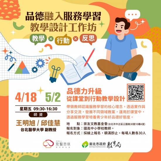 • 檢送財團法人見賢思琪教育基金會114年度「品德融入服務學習教學設計」工作坊簡章及活動簡介各1份,請鼓勵教師踴躍報名,本局同意公假課務派代出席,請查照。