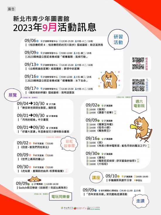 主旨:檢送本館新北市青少年圖書館「112年9月份活動、展覽及陪讀」活動資訊1份,請惠予轉知活動訊息,並鼓勵所屬踴躍參與,請查照。