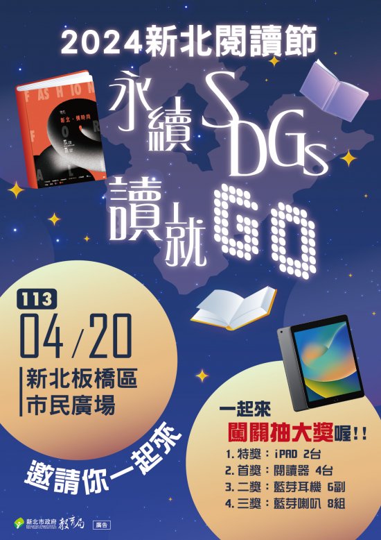 • 本市結合4月23日世界閱讀日,特辦理2024新北閱讀節「永續SDGs,『讀』就GO」活動,轉化與展現本市師生閱讀創作及展演之成果,期待親師生在閱讀歷程上都能有歷久彌新的感動與學習。