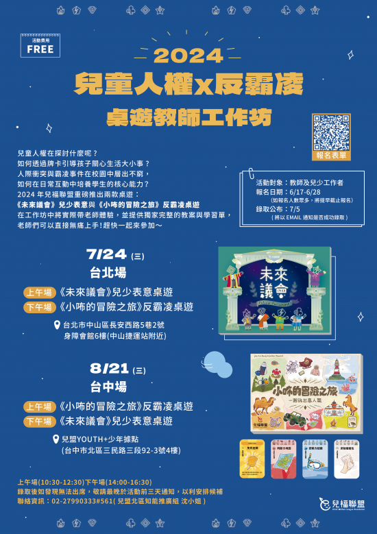 二、課程資訊: (一) 7/24(三)台北場|課程地點:身障會館6樓(台北市中山區長安西路5巷2號) 1、10:00-12:30《未來議會》兒少表意桌遊 2、14:00-16:00《小咘的冒險之旅》反霸凌桌遊 (二)8/21(三)台中場|課程地點:兒盟YOUTH+少年據點(台中市北區三民路三段92-3號4樓) 1、10:00-12:00《小咘的冒險之旅》反霸凌桌遊 2、14:00-16:30《未來議會》兒少表意桌遊
