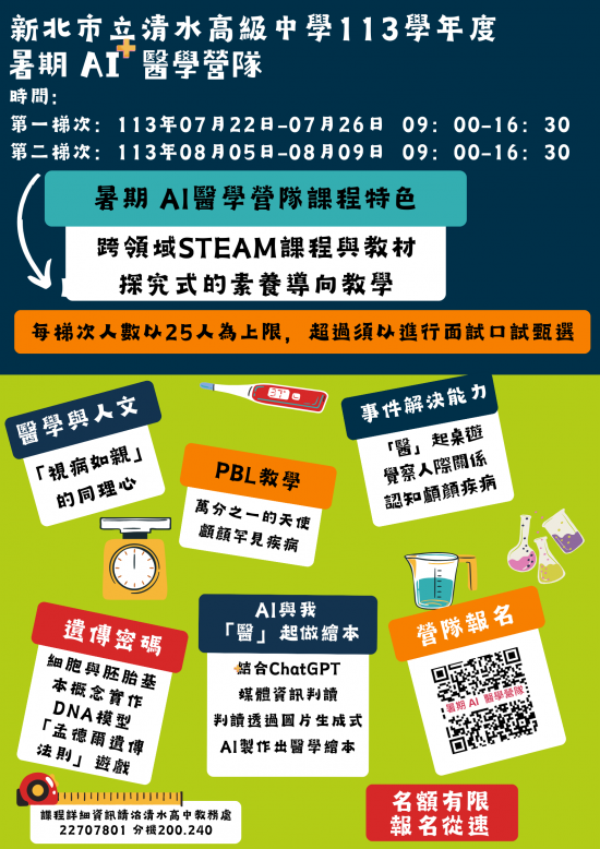 六、營隊詳情及報名資訊請上新北市立清水高級中學網站查詢(https://www.cssh.ntpc.edu.tw/p/406-1000-11910,r64.php;或洽本校教務處,電話(02)2820-3701分機200、240。