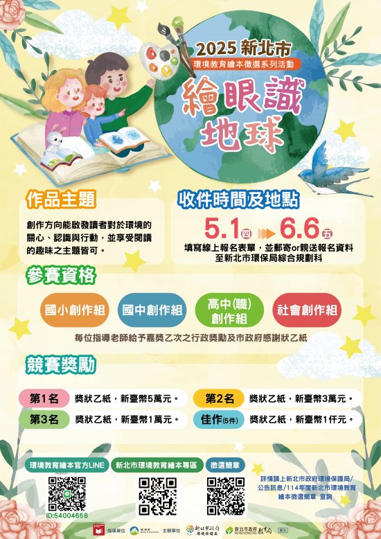 新北市政府環境保護局(以下稱環保局)辦理「114年度新北市環境教育繪本徵選」活動,請踴躍報名參加,請查照。