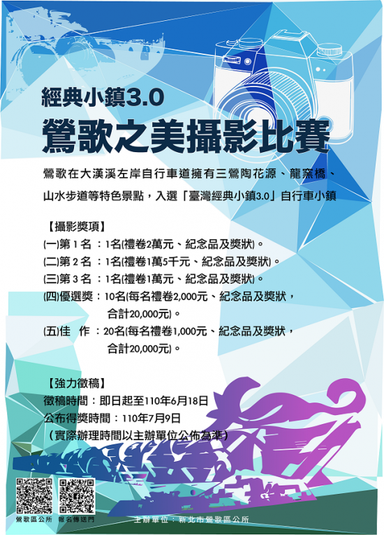 一、為推廣鶯歌自然景觀與人文風情之美,鼓勵愛好攝影人士,用鏡頭記錄鶯歌豐富多樣風貌,特辦理此活動。 二、徵件日期自即日起至110年6月18日(以郵戳日期為憑)。 三、有關參賽作品請郵寄或親送至新北市鶯歌區公所(經典小鎮攝影比賽工作小組),並於信封註明「參加經典小鎮3.0 鶯歌之美攝影比賽」。 四、本活動比賽簡章及相關報名資料,請至新北市鶯歌區公所官方網站最新消息項下(https://www.yingge.ntpc.gov.tw/)下載。如對於本活動有任何疑問,請洽新北市鶯歌區公所李尹齡小姐,電話:(02)26780202分機262。