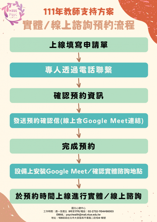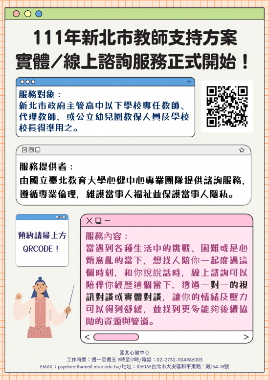 為促進與維護本市高級中等以下學校教師心理健康,協助教育現場第一線工作教師們排解工作及生活壓力,提供諮商、諮詢及支持服務,透過心理師及專業人員陪伴教師,以團體諮商及心理健康研習活動,在多元議題探討之中,促發教師自我覺察及統整,協助教師在輔導學生上的專業知能成長,間接增進學生身心發展。