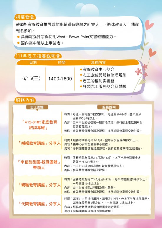 七、檢附「111年度家庭教育志工招募培訓暨服務」宣傳單1份(附件1、2)
