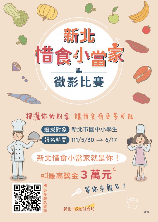 主旨:本府社會局111年辦理「新北惜食小當家徵影比賽」,訂於111年5月30日至6月17日受理報名,請貴校鼓勵學生踴躍參加,請查照。 說明: 一、依據本府社會局111年辦理新北惜食小當家選拔會資料辦理。 二、旨揭報名網址如下https://surplus-food.ntpc.gov.tw/,另檢附活動文宣資料乙張,請貴校協助向學生佈達活動資訊並透過網站、公佈欄及社群媒體等方式揭露旨揭活動訊息。 三、活動聯繫窗口請洽本府社會局承辦人宋治曄社工師,電話:(02)29603456分機3146。