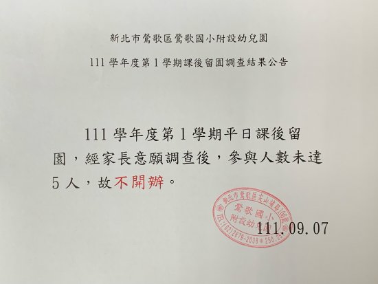 111學年度第1學期平日課後留園,經家長意願調查後,參與人數未達5人,故不開辦