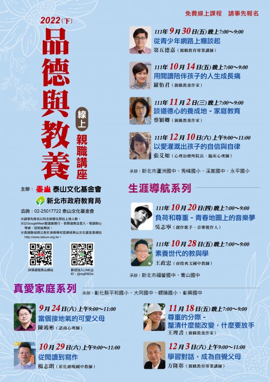 二、為強化親師對當代品德教育核心價值之認知與實踐力,落實品德教育行善之成效,本局與財團法人泰山文化基金會合作辦理旨揭講座場次及講題如下: