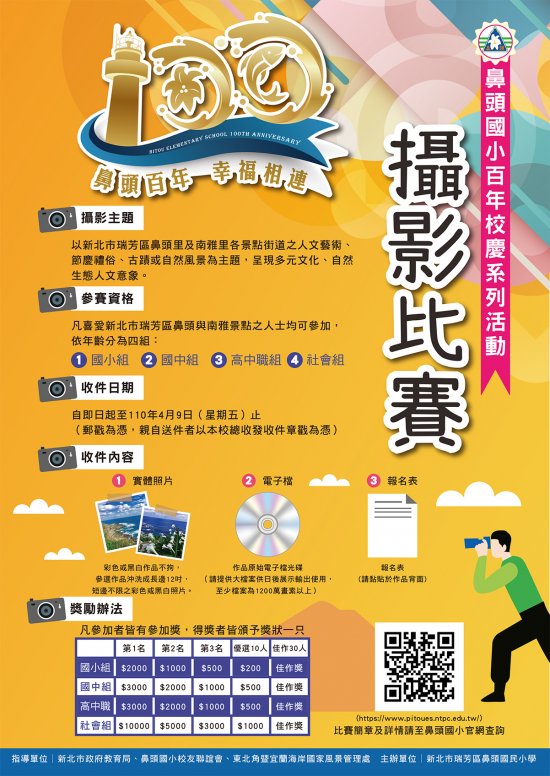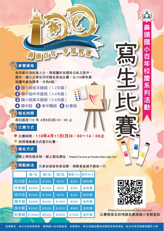 一、為慶祝本校創校100周年紀念暨推廣藝術教育,落實藝術生活化,培育藝術人才,結合戶外教育,鼓勵藝術教育推展與觀光發展。 二、凡喜愛新北市瑞芳區鼻頭與南雅景點之人士均可參加,依年齡分組。 指導單位:新北市政府教育局、鼻頭國小校友聯誼會、東北角暨宜蘭風景管理處。 主辦單位:新北市瑞芳區鼻頭國民小學。 四、比賽辦法:詳如附件。 攝影比賽收件日期:自即日起至110年4月9日止。 寫生比賽一律採網路報名,自即日起至110年4月8日18:00止,報名網址:https://forms.gle/qkeLzvESNJpcXBfPA 寫生比賽日期:110年4月11日(日)。 五、檢附「鼻頭百年 幸福相連」百年校慶攝影比賽實施計畫及海報、寫生比賽實施計畫及海報供參,敬請協助公告,鼓勵踴躍報名參加。