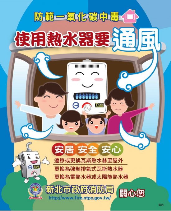 使用燃氣熱水器時,若有頭昏、噁心、嗜睡等身體不適情況發生,請立即停止盥洗,打開通往室外的窗戶通風,身體嚴重不適時,請先前往通風良好的室外環境,再打119電話求助。