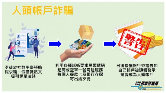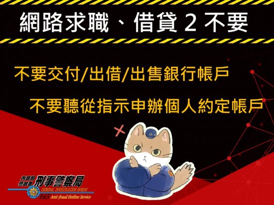 為防範「假求職」、「假借貸」訊息,避免貿然提供個人 帳戶致遭利用為「人頭帳戶」。