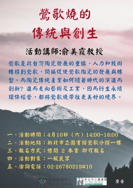 講座資訊及報名方式請參閱活動海報,或洽詢鶯歌分館服務台,電話:鶯歌分館(02)26780220分機10