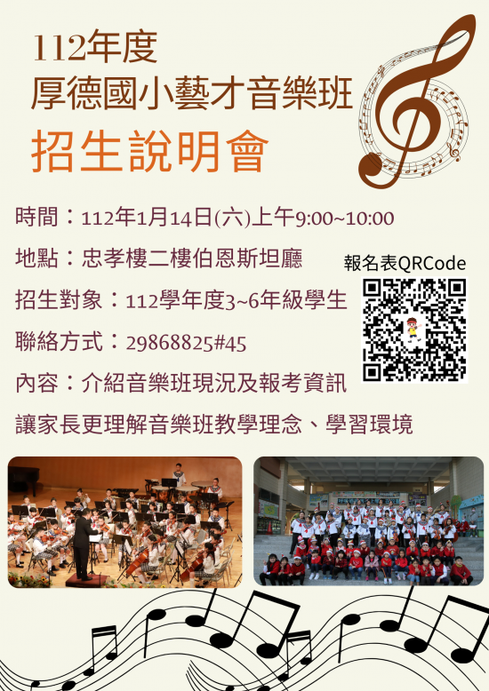 二、旨揭說明會資訊如下: 時間:112年1月14日(六)早上9時。 地點:本校忠孝樓二樓伯恩斯坦廳。 活動內容:簡介本校藝才音樂班現況及112學年度報考資訊,並以適性發展及最新相關升學管道為主,讓同學與家長更進一步了解本校音樂班的學習環境及未來發展。 報名方式:請掃描海報QR-CODE填寫表單-報名https://forms.gle/adgkpNX7VeTJtDh68。