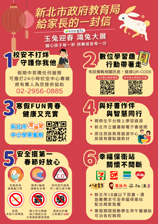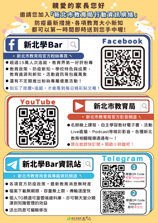 相關宣 導內容將於本局「新北學Bar」臉書粉絲專頁宣傳推播,請各校轉知家長點閱並分享,亦請加入「新北市教育局行動 資訊網絡」掌握防疫最新措施及各項教育新知。