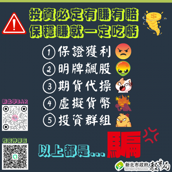 「保證獲利」、「明牌飆股」、「外匯(期貨)代操」、「虛擬貨幣」、「投資群組」