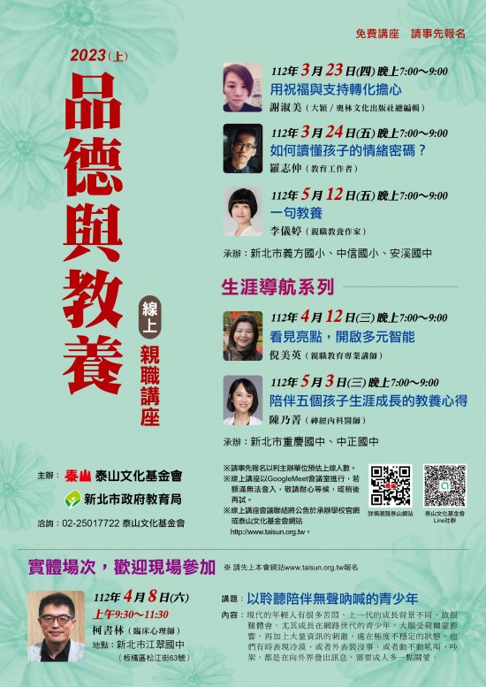 二、為強化親師對當代品德教育核心價值之認知與實踐力,落實品德教育行善之成效,本局與財團法人泰山文化基金會合作辦理旨揭講座場次及講題如下: