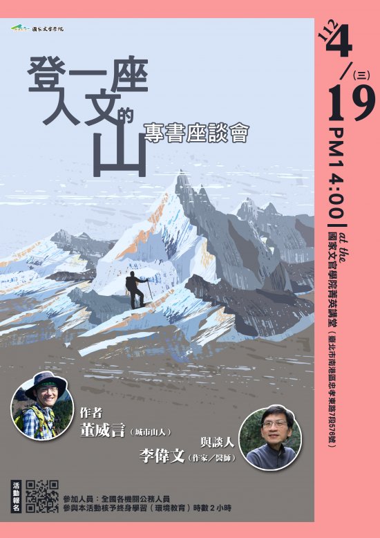主旨:有關國家文官學院辦理「每月一書」導讀數位課程暨《登一座人文的山》專書座談會一案,請查照並轉知所屬同仁踴躍報名參加。