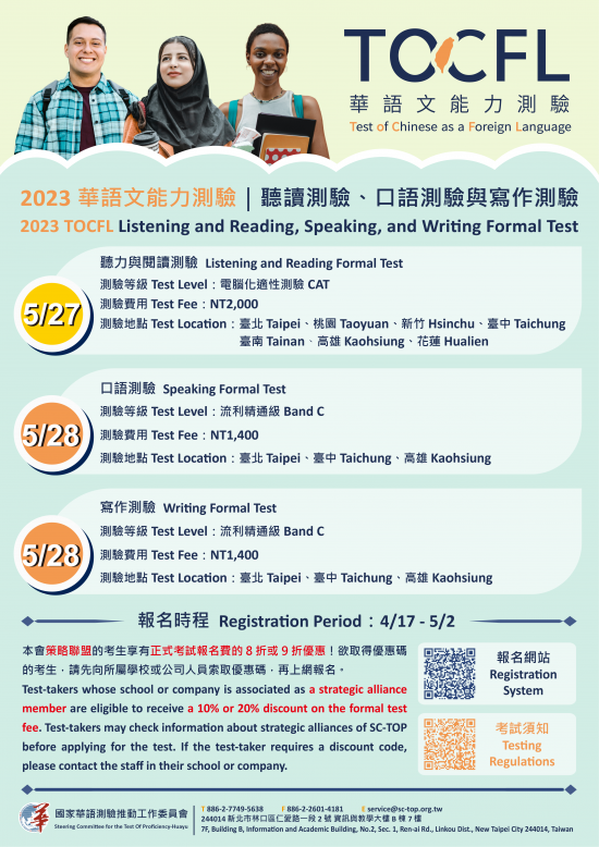 優惠訊息: 同時報考聽讀、口語和寫作考試三項測驗,可以享八折優惠。 為華測會策略聯盟單位,所屬僑外生可享九折優惠。 若策略聯盟單位系所,以華語文能力測驗作為入學或畢業門檻,所屬學位生可享八折優惠。