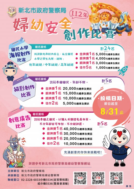 七、得獎公布:得獎作品預訂於112年9月底前,於本局婦幼警察隊網站公布,並通知得獎者領獎事宜。