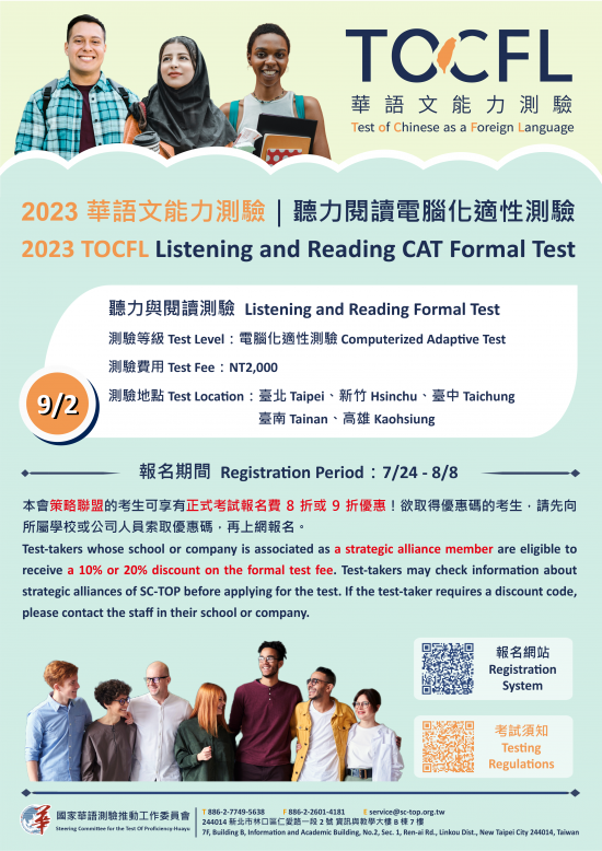 三、線上模擬測驗:https://tocfl.edu.tw/index.php/exam/test/page/19。 四、檢送華語文能力測驗海報1份。