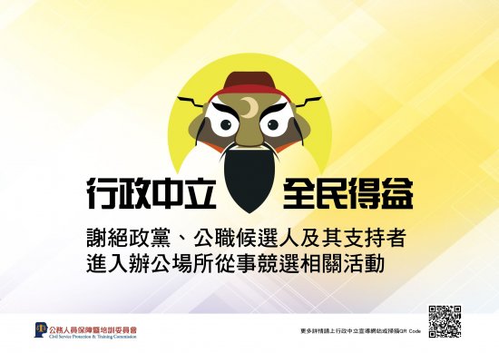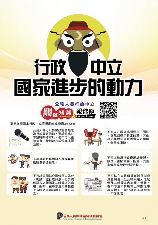 說明: 一、依據公務人員保障暨培訓委員會(以下簡稱保訓會)112年9月11日公訓字第1122160296號函辦理,並檢附原函影本1份。 二、為因應113年第16任總統、副總統與第11屆立法委員選舉將屆,保訓會製作旨揭文宣品,請各機關協助轉知所屬單位人員,以強化公務人員對於行政中立之瞭解,並提醒公務人員應嚴守行政中立並維護行政中立之公務環境。 三、前開行政中立文宣電子檔,均置放於保訓會全球資訊網(https://www.csptc.gov.tw)「行政中立專區/公務人員行政中立訓練及宣導/圖像及影音電子檔」項下,歡迎自行下載運用,俾擴大宣導成效。 四、檢附「宣導海報」、「告示說明」及「公務人員行政中立實務案例宣導手冊」之電子檔各1種。
