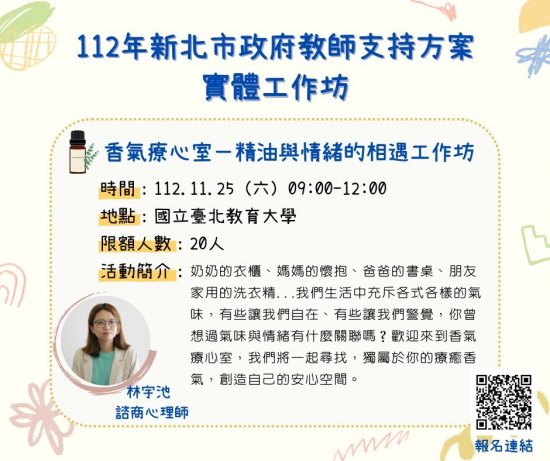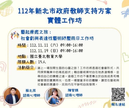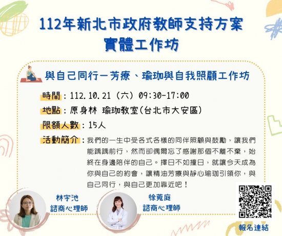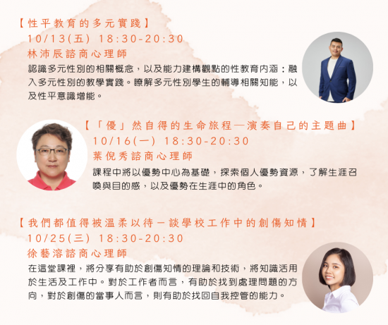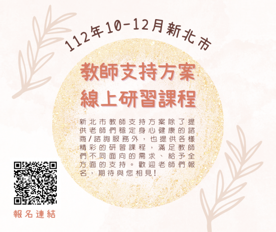 為促進與維護本市高級中等以下學校教師心理健康,協助教育現場第一線工作教師排解工作及生活壓力,提供諮商、諮詢及支持服務,透過心理師及專業人員陪伴教師,以團體諮商及心理健康研習活動,在多元議題探討之中,促發教師自我覺察及統整,協助教師輔導學生專業知能成長。