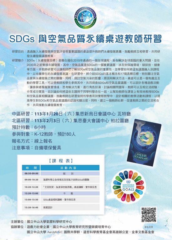 轉知金車文教基金會協辦之「SDGs與空氣品質永續桌遊教師研習」研習活動資訊,歡迎參加。