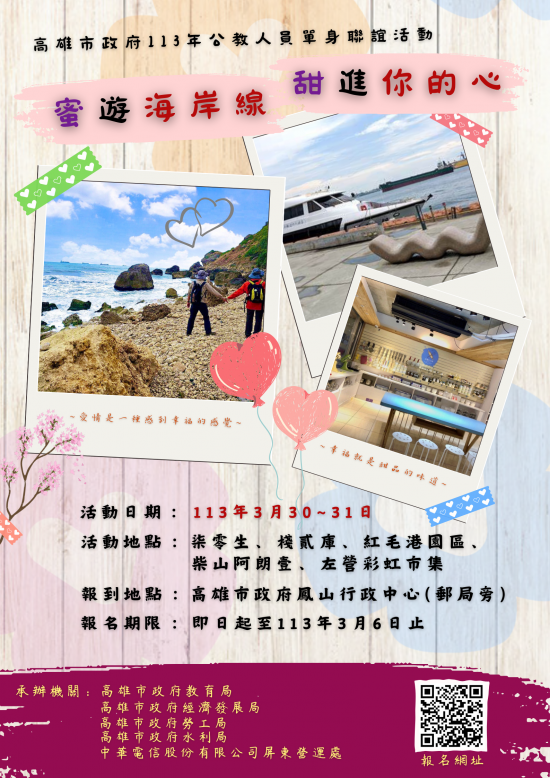 主旨:檢送高雄市政府113年「蜜遊海岸線‧甜進你的心」公教人員單身聯誼活動計畫及報名表各1份,請查照並轉知所屬符合資格之單身同仁踴躍報名參加。