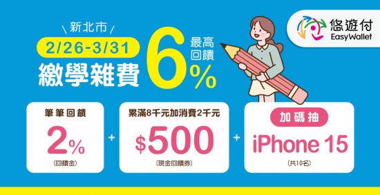 2、凡以悠遊付繳納新北市學雜費,加碼抽iPhone15共10名。
