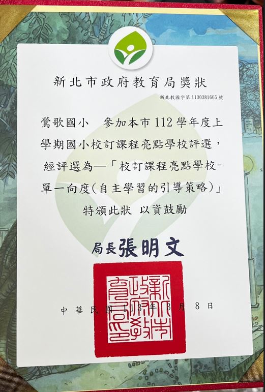 本校二年級閱讀校訂課程:參加新北市校訂課程亮點學校評選,經教育局訪視後評定為-校訂課程亮 點學校-自主學習的引導策略,課程實踐優良學校。本次課程計畫撰寫人-聶先怡老師,課程計畫訪視及公開課、課程設計-賴玉敏老師,公開課班級-201班(張祐綺老師),植物地圖協作:葉芳君老師。感謝課程諮詢協作的二年級各班導師及陳振威主任、教務處團隊。