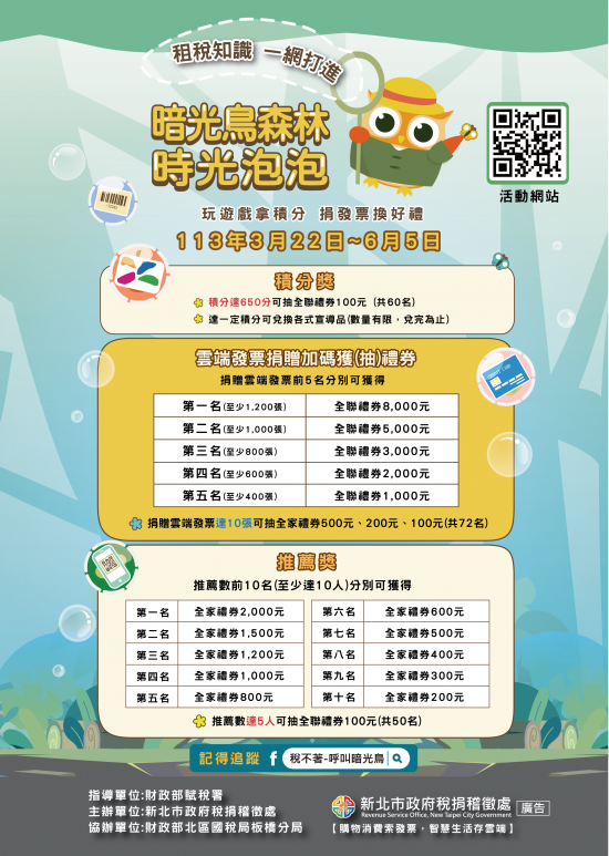 二、活動詳情請上「稅不著—呼叫暗光鳥」粉絲專頁(https://www.facebook.com/ntpctax/)或活動網站(https://bubble.tax-go.tw/)查詢。