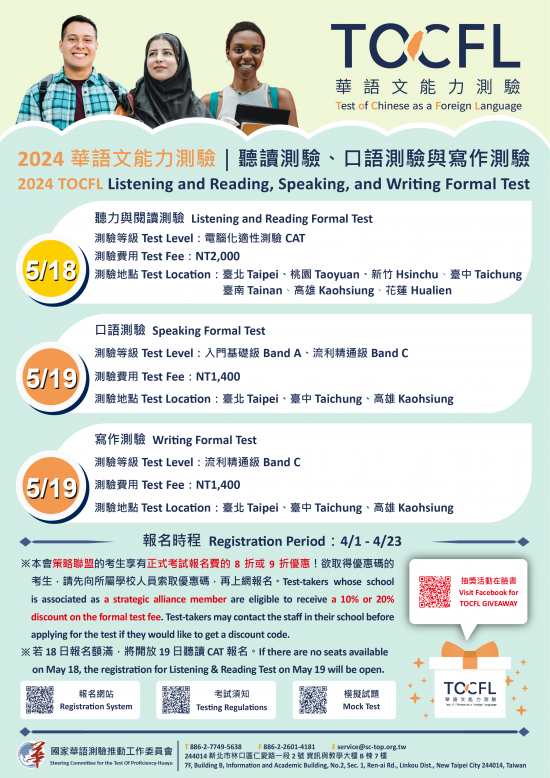 • 抽獎活動:凡報考口語或寫作測驗並完成繳費者,可參加華測FB粉絲專頁抽獎活動。詳情請見粉絲專頁貼文:https://www.facebook.com/SCTOP.TOCFL
