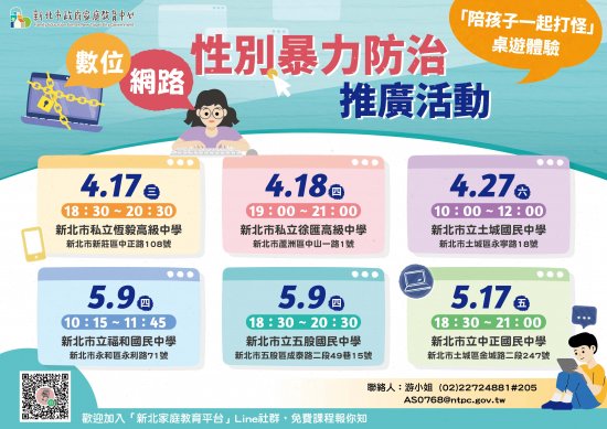 • 「陪孩子一起打怪」數位網路性別暴力防治推廣:新北市家庭教育中心辦理系列防治數位性別暴力親職講座,請貴校協助轉知家長活動資訊,講座場次如附件。