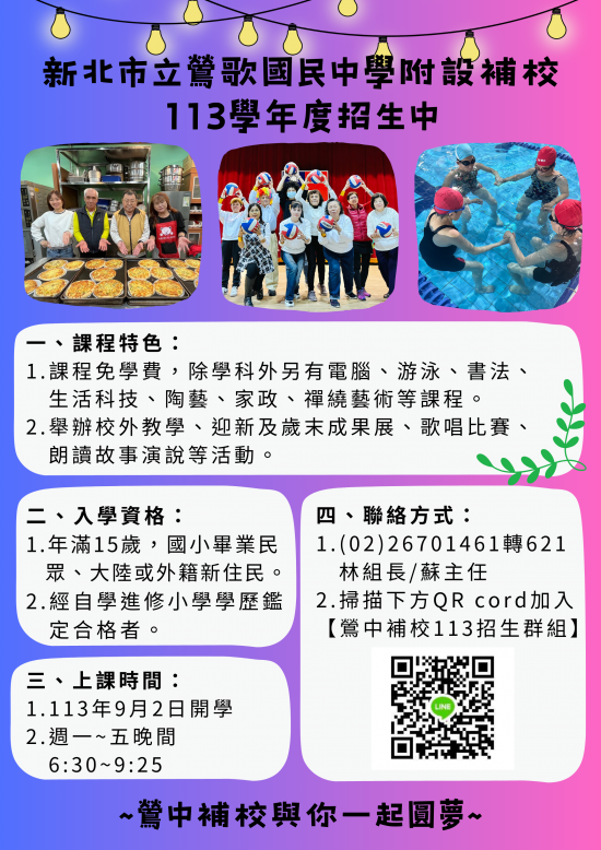 • :「新北市立鶯歌國民中學附設補校自即日起辦理113學年度補校招生,歡迎踴躍報名,有意者請洽2670-1461轉621」。