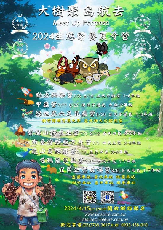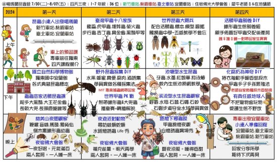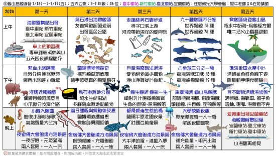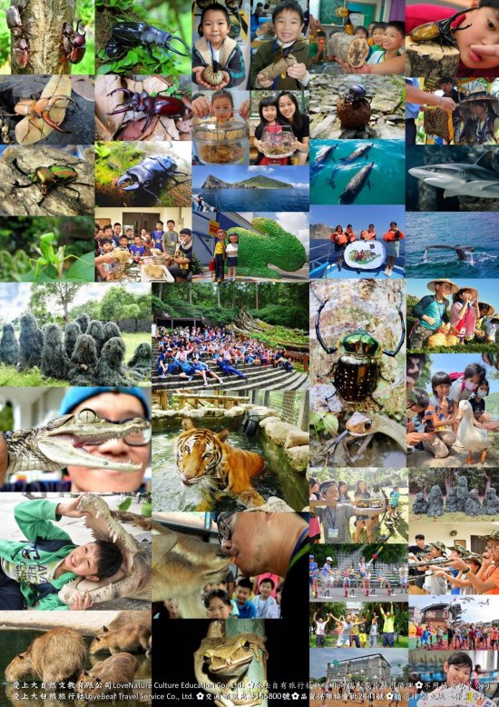 三、課程主題:蘭陽山野求生營、南臺灣諾亞方舟營、龜山島鯨豚營、噶瑪蘭昆蟲營、宜蘭生態農場營、動力科學營、甲蟲營、綠世界六足昆蟲營。