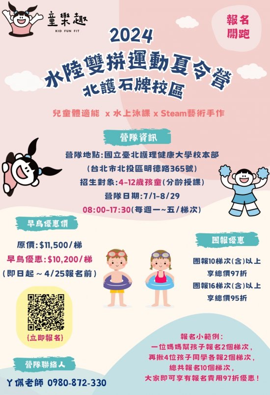 一、本校推廣教育中心與童博健康管理工作室合作開辦「2024水陸雙拼運動夏令營」即日起受理報名。