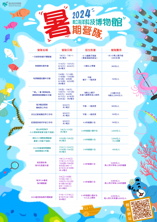 一、本館具有山海的自然景觀之外,亦有海洋科技、文化、生物與環境等課程資源,為提供全民優質的課程體驗,於113年7月3日至8月30日期間,推出一系列暑期營隊活動,希望全民可以在沉浸式的情境中,度過一個不一樣的暑假。