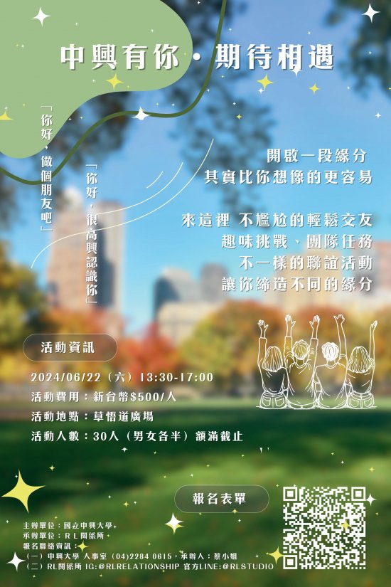 主旨:檢送國立中興大學辦理113年「中興有你,期待相遇」單身聯誼活動實施計畫、活動海報及報名表各1份,請查照並鼓勵符合資格之單身同仁踴躍報名參加。