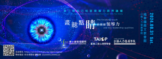 主旨:行政院人事行政總處公務人力發展學院與康士藤管理顧問公司及臺灣工商心理學學會(TAIOP)訂於113年8月31日(星期六)共同主辦「2024第三屆知己知彼領導力跨界論壇─畫龍點睛的關鍵領導力」,請查照並轉知所屬同仁踴躍報名參加。