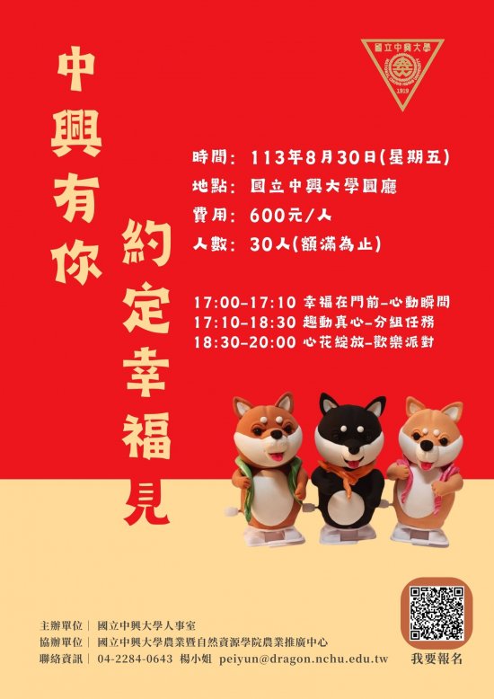 主旨:檢送國立中興大學辦理113年「中興有你,約定幸福見」單身聯誼活動實施計畫及活動海報各1份,請查照並鼓勵所屬符合資格之單身同仁踴躍報名參加。
