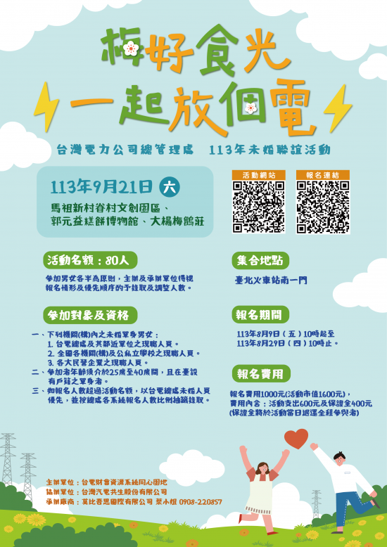 主旨:檢送台灣電力公司總管理處113年度「梅好食光,一起放個電」未婚聯誼活動計畫、退費規範、宣傳DM及景點介紹各1份,請查照並鼓勵所屬未婚同仁踴躍報名參加。