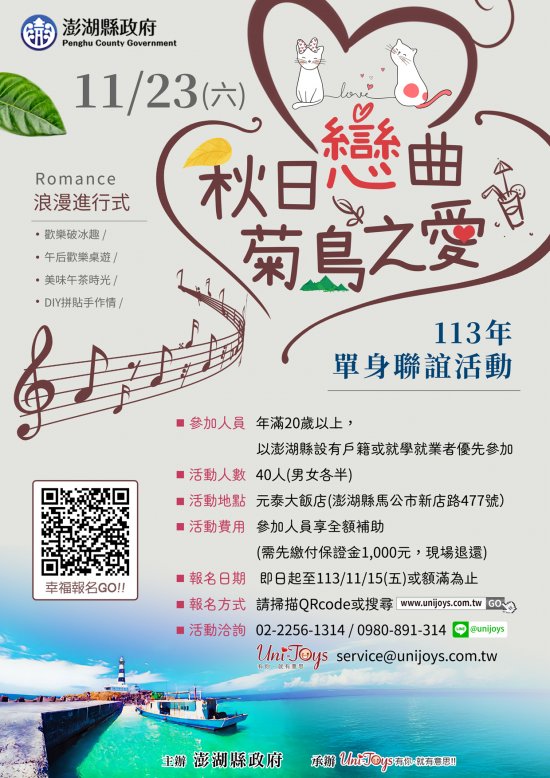 主旨:檢送澎湖縣政府辦理113年「秋日戀曲 菊島之愛」第3梯次單身聯誼活動實施計畫、行程表及活動海報各1份,請查照並轉知所屬單身同仁踴躍報名參加。