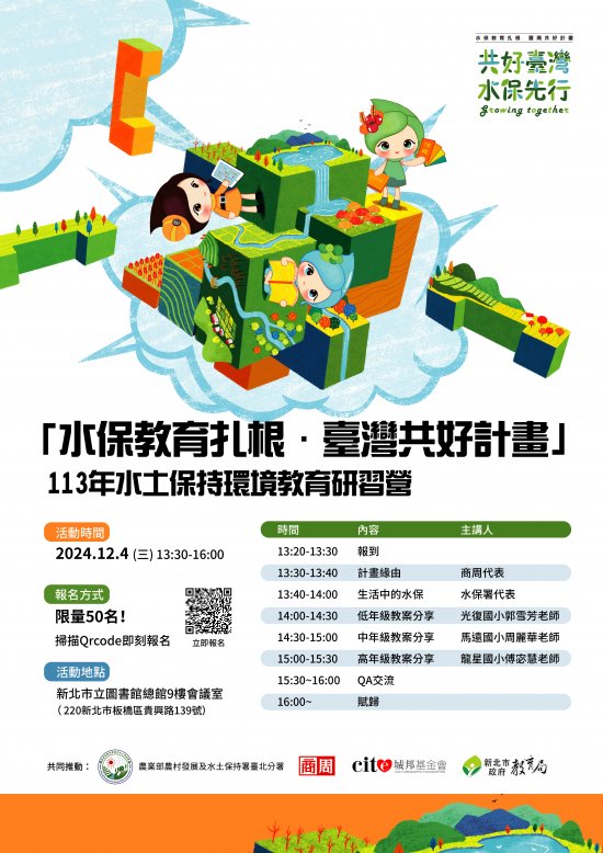 轉知農業部農村發展及水土保持署臺北分署與商周編輯顧問股份有限公司合作辦理「113年水土保持環境教育研習營」,歡迎教師踴躍參與